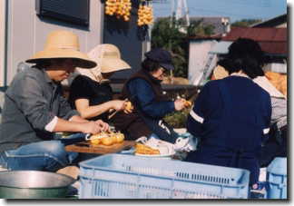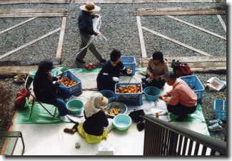 参加者が車座になって、おしゃべりに花を咲かせながら皮をむき、「干し柿」づくりをします