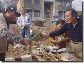 隣接する竹林から竹を切り出して杯、銚子を作り、焚き火でお燗をつけました。